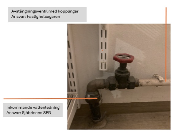 - För vattenledningen efter serviceventilen (förbindelsepunkt) i mark och grund samt ventilbrunnen med tillhörande ventiler som är placerad i hallen på nederplan och vattenledningen fram till kopplingarna som ansluter till avstängningsventilen före vattenmätaren.