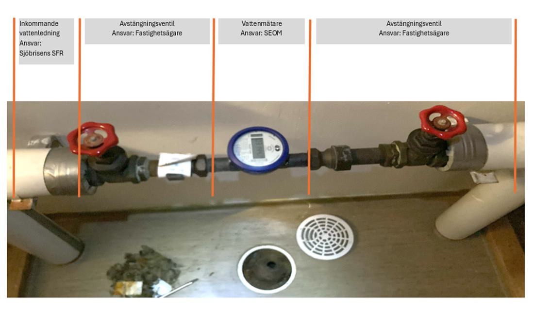 - För mätarkonsolen med tillhörande avstängningsventiler (2st) samt vattenledningarna i fastigheten.